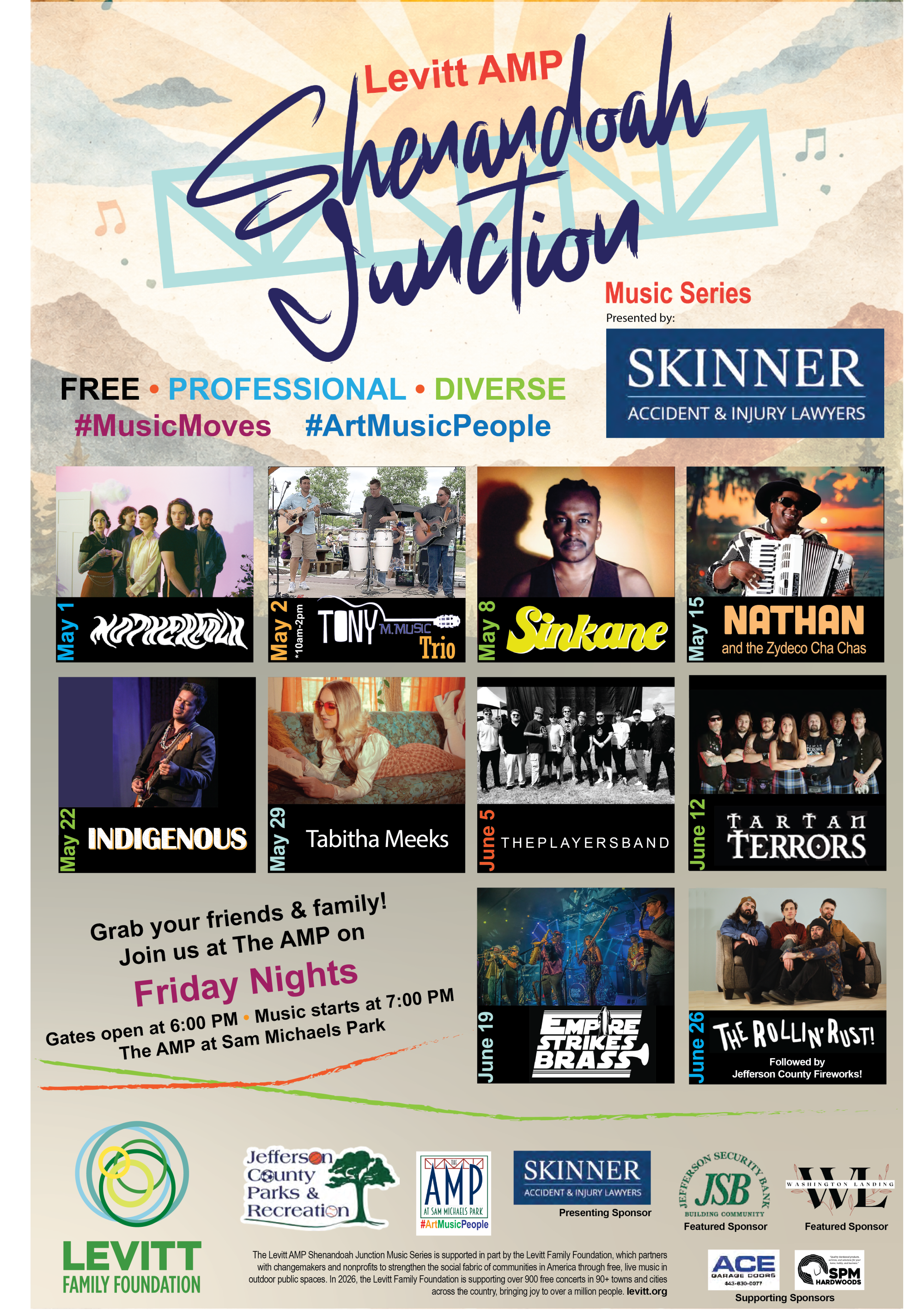 Jefferson County Parks and Recreation Commission is proud to announce the 2025 Levitt AMP Shenandoah Junction Music Series, which will take place on Friday evenings from May 1-June 26, 2026 at The AMP at Sam Michaels Park.